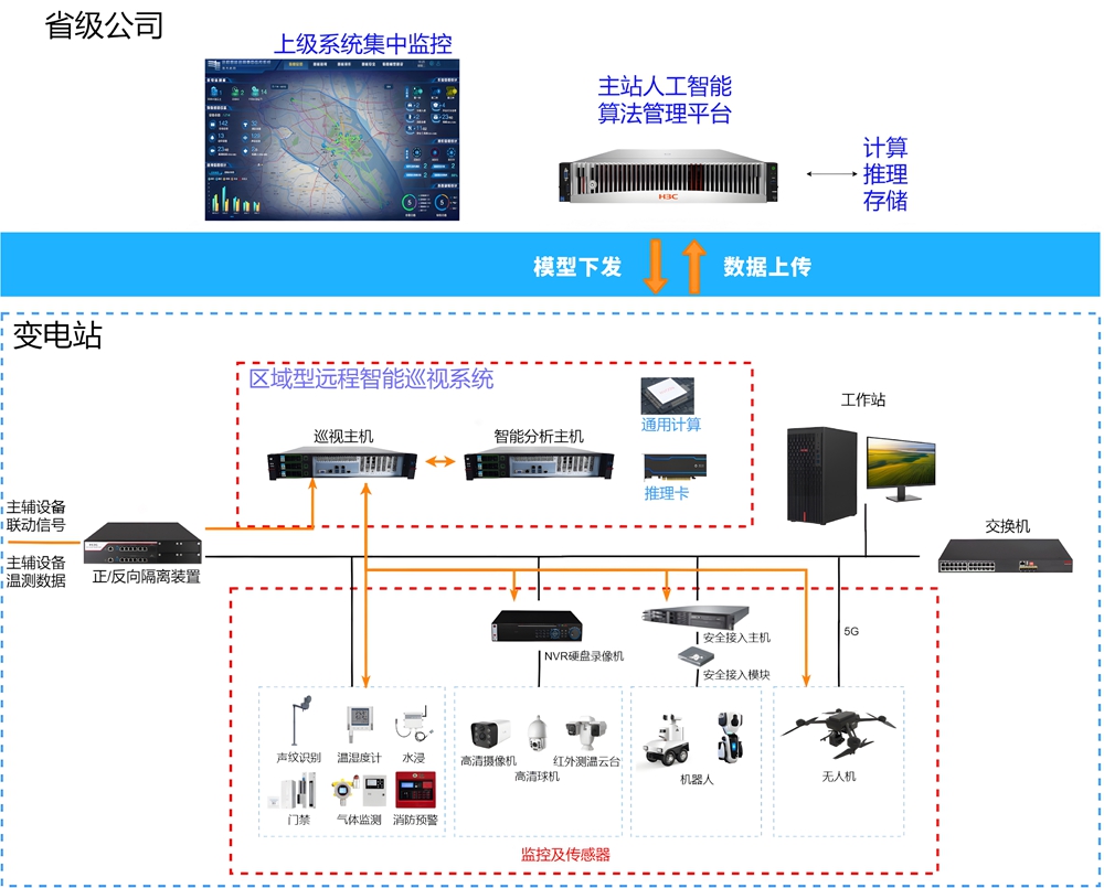 • 变电站远程智能巡视系统部署于站端,融合智慧物联、A1、5G、边缘计算技术,构建三维数字孪生模型。系统涵盖巡视主机、智能分析主机、巡视机器人、监控、无人机及环境监测装置。