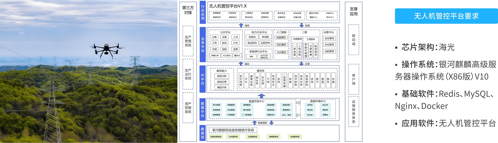 本解决方案主要应用于能源行业各类重大设备的无人巡检场景,可改变传统的人工巡检方式受地形复杂、线路漫长等导致的效率低下问题。通过搭载高清摄像头和红外热像仪等设备,无人机可以快速准确地巡视高空杆塔、复杂线路、风机和光伏发现潜在故障风险,提前进行预防维护,确保电力系统的安全稳定运行。无人机管控平台要求采用信创方案。